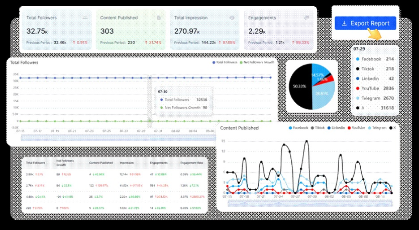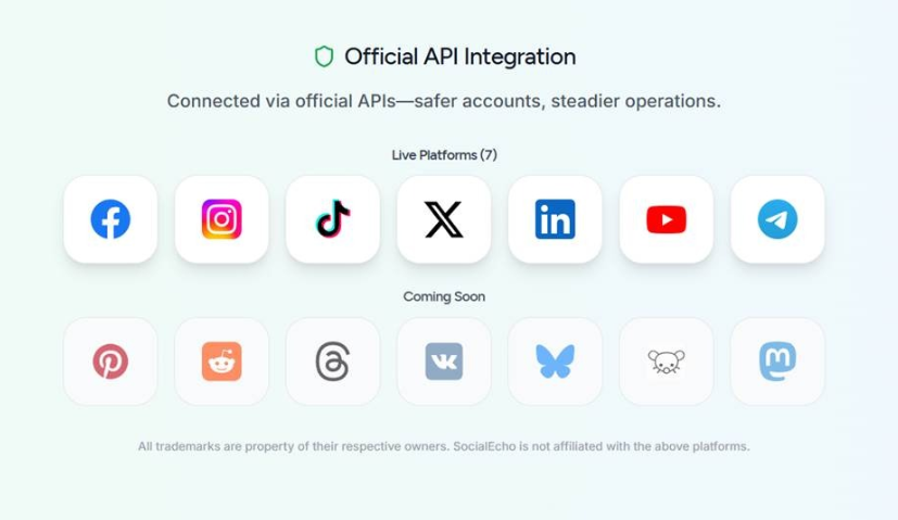 It connects seamlessly with seven major platforms—Facebook, Instagram, X (Twitter), TikTok, YouTube, Telegram, and LinkedIn, through official APIs to ensure a secure and reliable workflow.