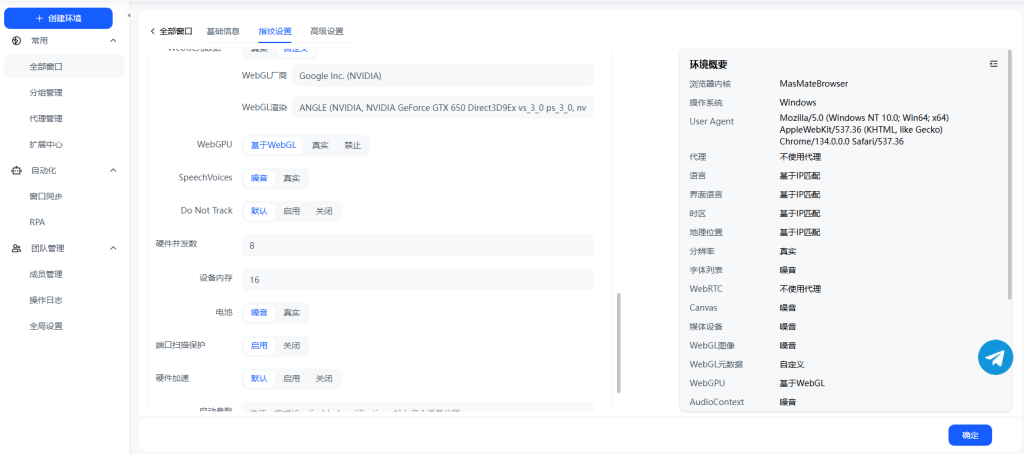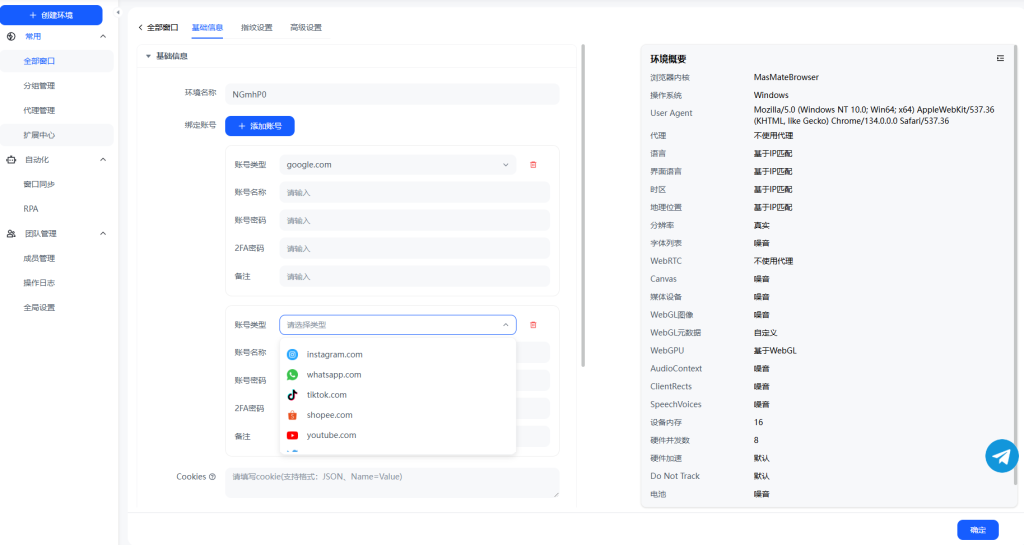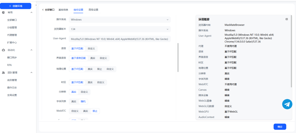 MasLogin 支持高级浏览器指纹自定义,包括 Canvas、WebGL、User-Agent、时区、字体、分辨率等多维度参数。