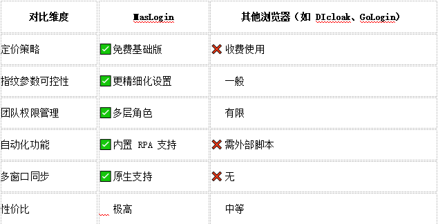 相比于 Multilogin、GoLogin、AdsPower 等同类产品,MasLogin 在 价格、性能、使用限制 方面更具优势。