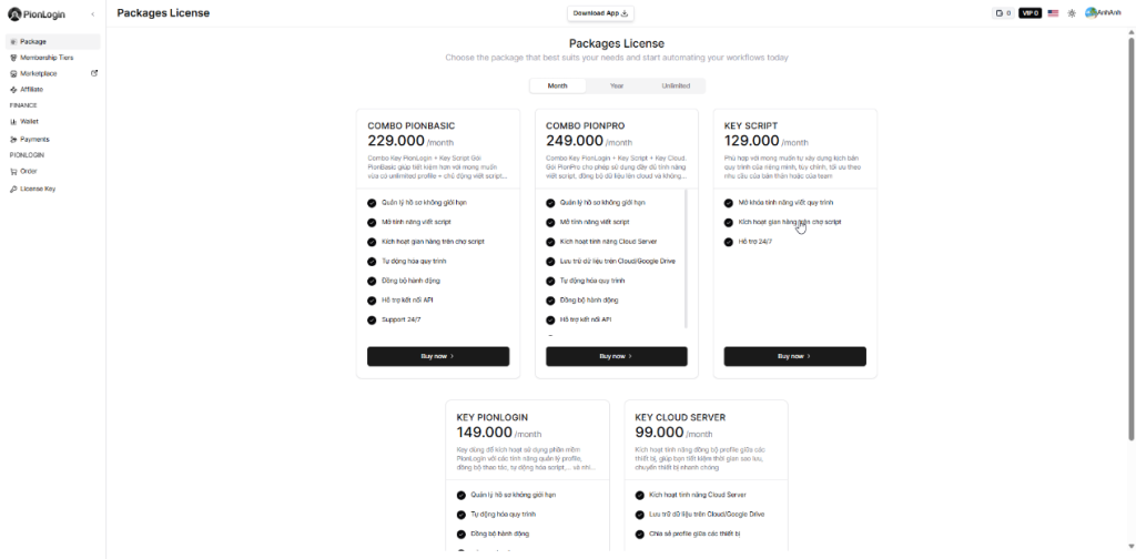 | Combo Key PionLogin + Key script + Key Cloud storage | 249,000 VND | 1,690,000 VND | 2,490,000 VND | 包含无限配置文件、自定义脚本自动化以及数据同步到云端 |